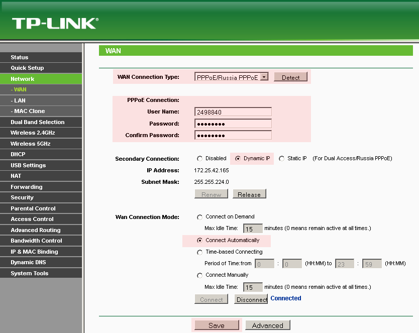 4. WAN Connection Mode: поставить галочку в поле "Connect Automatically"