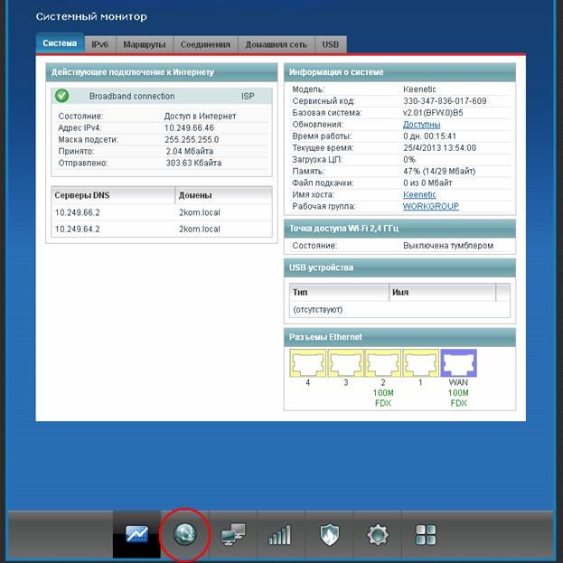 Теперь приступим к настройке основной части интернет-центра ZyXel Keenetic — сетевой. Именно в сетевой части Вы заносите параметры для соединения роутера Keenetiс со своим провайдером Интернета. Приступить к настройке соединения Вы можете, нажав кнопку Интернет внизу, как показано на рисунке ниже: