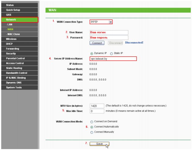 1. Следуйте в раздел Network → WAN(Сеть → WAN), где соответствующие поля нужно заполнить следующим образом: