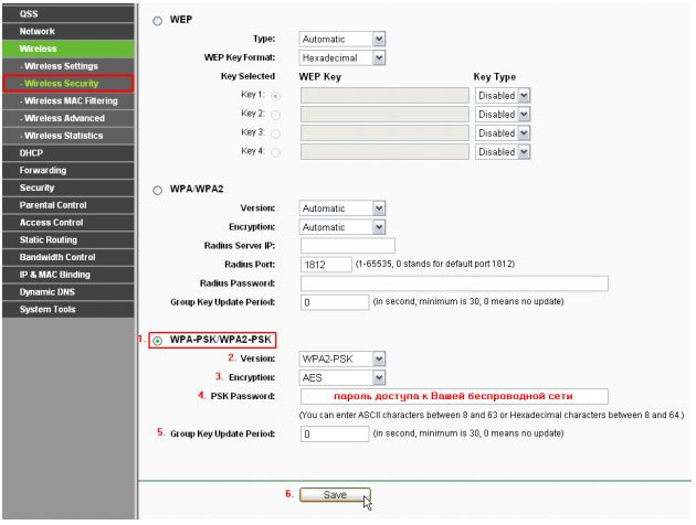 Затем следуйте в раздел Wireless Security (Безопасность беспроводной сети), где нужно указать следующие параметры:
