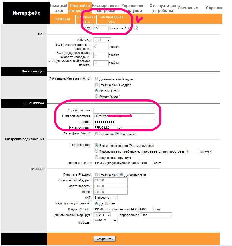 правило VPI - 0, VCI - 35 и указываем логин и пароль доступа к интернету, не