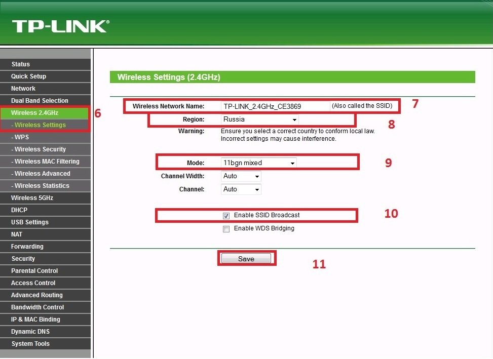 - "Mode"(9): это стандарт связи, для коммуникации в беспроводной локальной сетевой зоне частотных диапазонов 2,4 ГГц. Рекомендуем выбрать 802.11b/g/n