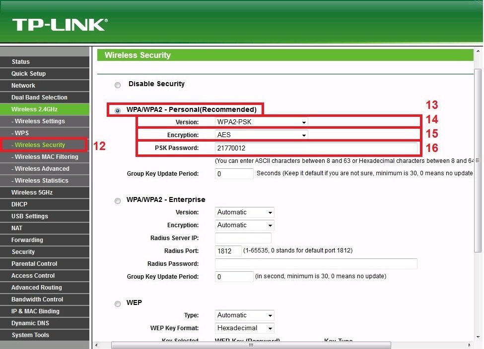 - "Проверка подлинности"(14):WPA2-PSK- рекомендуем выбрать именно этот пункт, для большей совместимости с беспроводными устройствами.