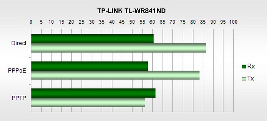 Результаты, надо сказать, немного неожиданные. Если скорость отправки (Tx) ожидаемо падает от прямого подключения к PPTP, то скорость приёма с PPTP подключением, судя по графику, даже немного возросла. Полагаю, следует признать, что маршрутизатор TL-WR841ND практически не демонстрирует падения скорости передачи данных из WAN в LAN от смены типа подключения, а небольшие колебания сложно отличить от погрешности измерения.