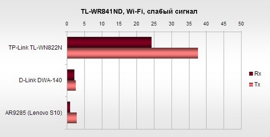 Удивительно, но два "родных" устройства TP-LINK в условиях отличного приёма оказались не лучшим сочетанием. Давайте посмотрим, как изменится картина в условиях плохого приёма. Для имитации очень слабого сигнала от маршрутизатора были отсоединены обе антенны, мощность передатчика в интерфейсе настройки понижена до минимального уровня, а Wi-Fi адаптеры удалены приблизительно на шесть метров за преграду в виде бетонной (правда не несущей) стены.