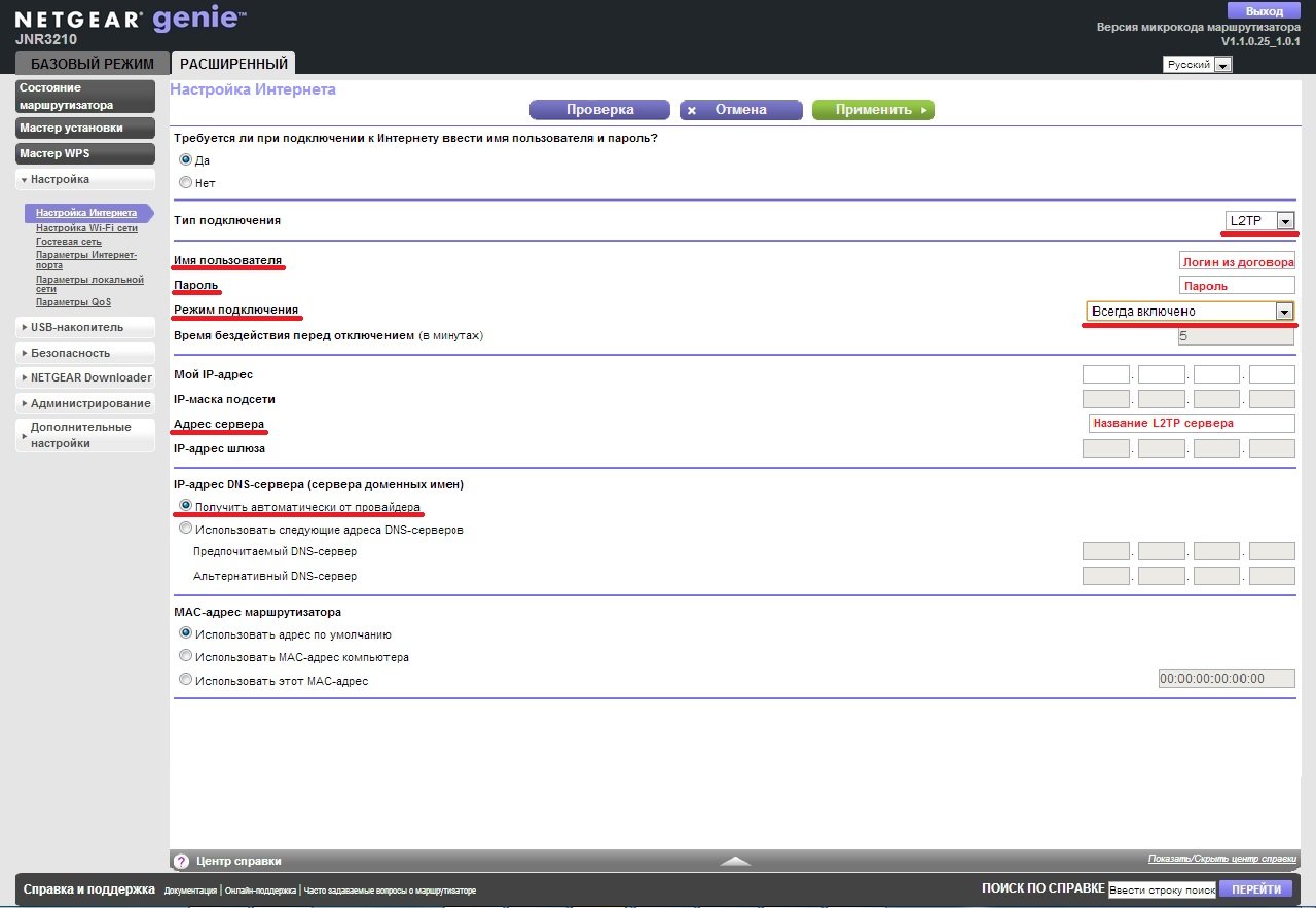 Если провайдер использует привязку по MAC-адресу, и Вы настраиваете маршрутизатор с ПК, который до этого был подключён к сети интернет, то для поля MAC-адрес маршрутизатора укажите опцию Использовать MAC-адрес компьютера. Если привязка по MAC-адресу у провайдера отсутствует, то оставляем опцию по умолчанию - опцию Использовать MAC-адрес по умолчанию. И нажимаем кнопку Применить.