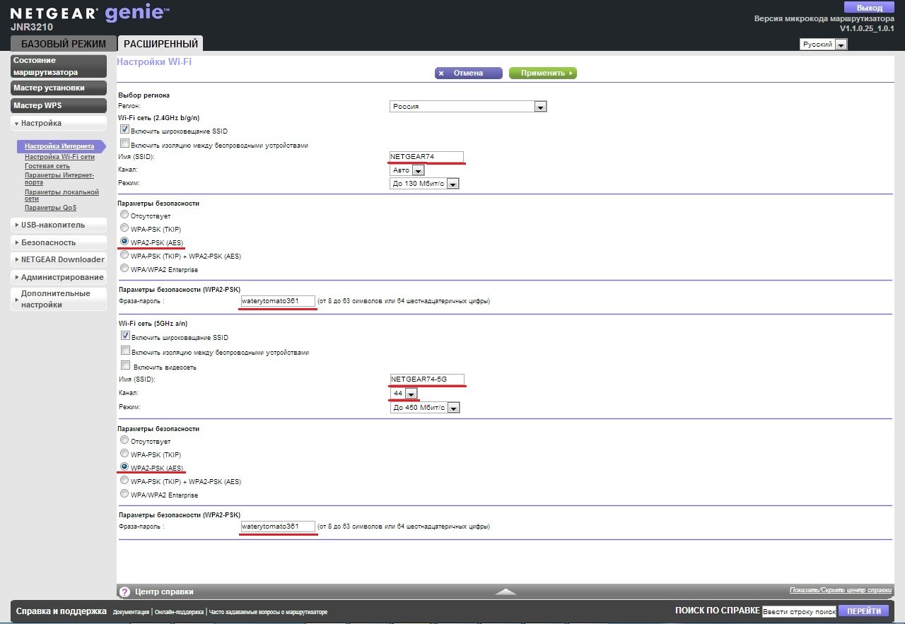 Заходим в пункт меню Настройка Wi-Fi сети. Имя (SSID) - указываете название для первой и для второй сети, но они должны различаться. В качестве режимов безопасности рекомендуется использовать самые современные, например, WPA2-PSK с шифрованием [AES], так как он даёт максимальную производительность и защиту сети. После выбора данного режима необходимо задать фразу пароль, которая будет использоваться для подключения всех беспроводных wi-fi-устройств к маршрутизатору. Постарайтесь использовать сложную фразу и запишите её! Использование комбинаций типа "qwerty" или "1234567" могут быть взломаны злоумышленниками за считанные секунды.