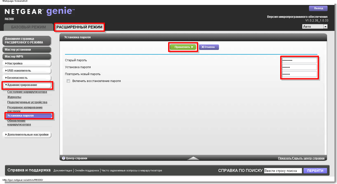 В целях безопасности рекомендуется сменить заводской пароль. По умолчанию: Логин admin, пароль password. В интерфейсе роутера необходимо зайти во вкладку «Расширенный режим», далее «Администрирование», затем «Установка пароля».В поле «Старый пароль» введите password, в поле «Установка пароля» введите новый пароль, в поле «Повторить новый пароль» введите новый пароль ещё раз. Выше будет кнопка«Применить».