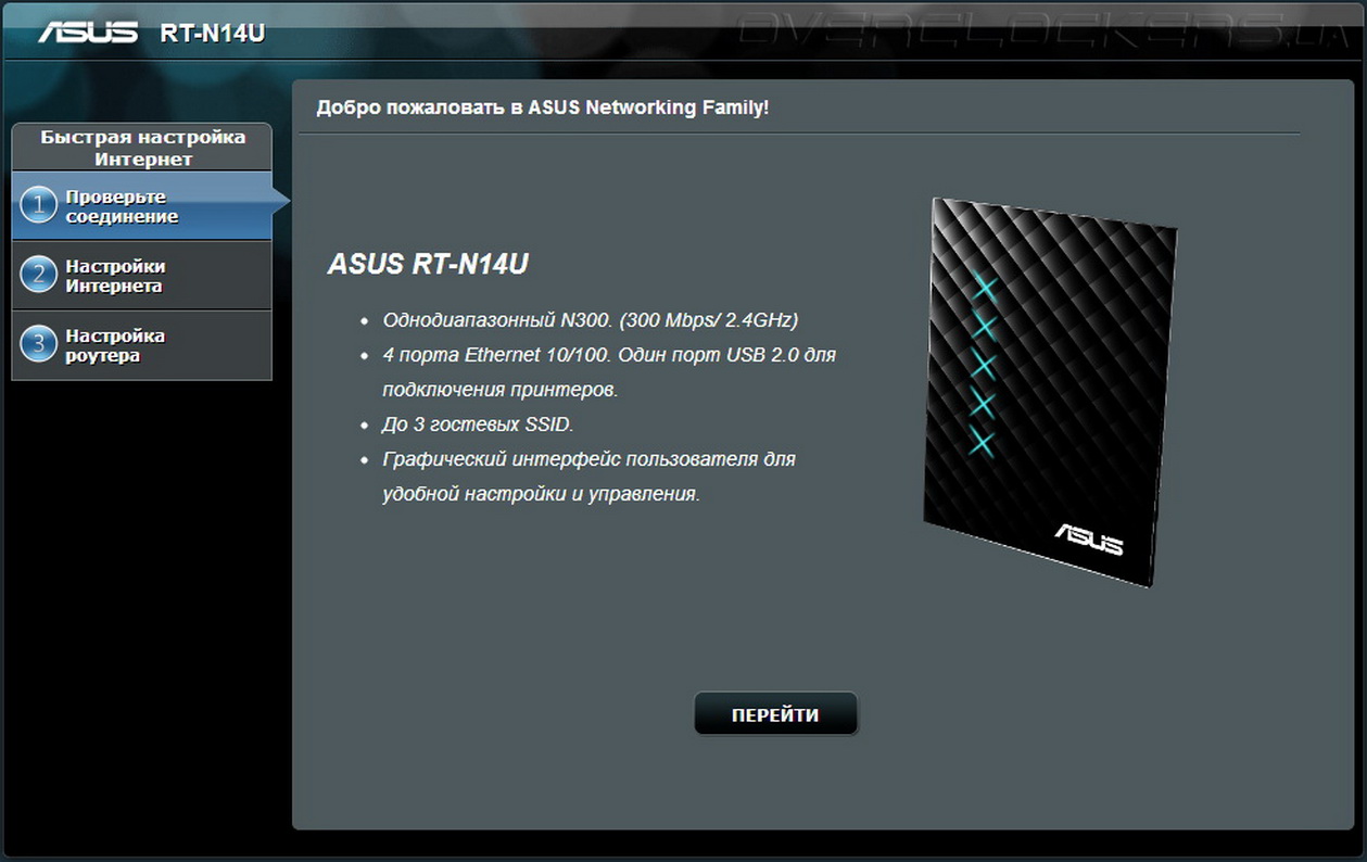 Подключившись через браузер (192.168.1.1) к веб-интерфейсу роутера увидим меню настройки. Нам предложат быструю настройку в три шага, что будет актуально для малоопытных пользователей.