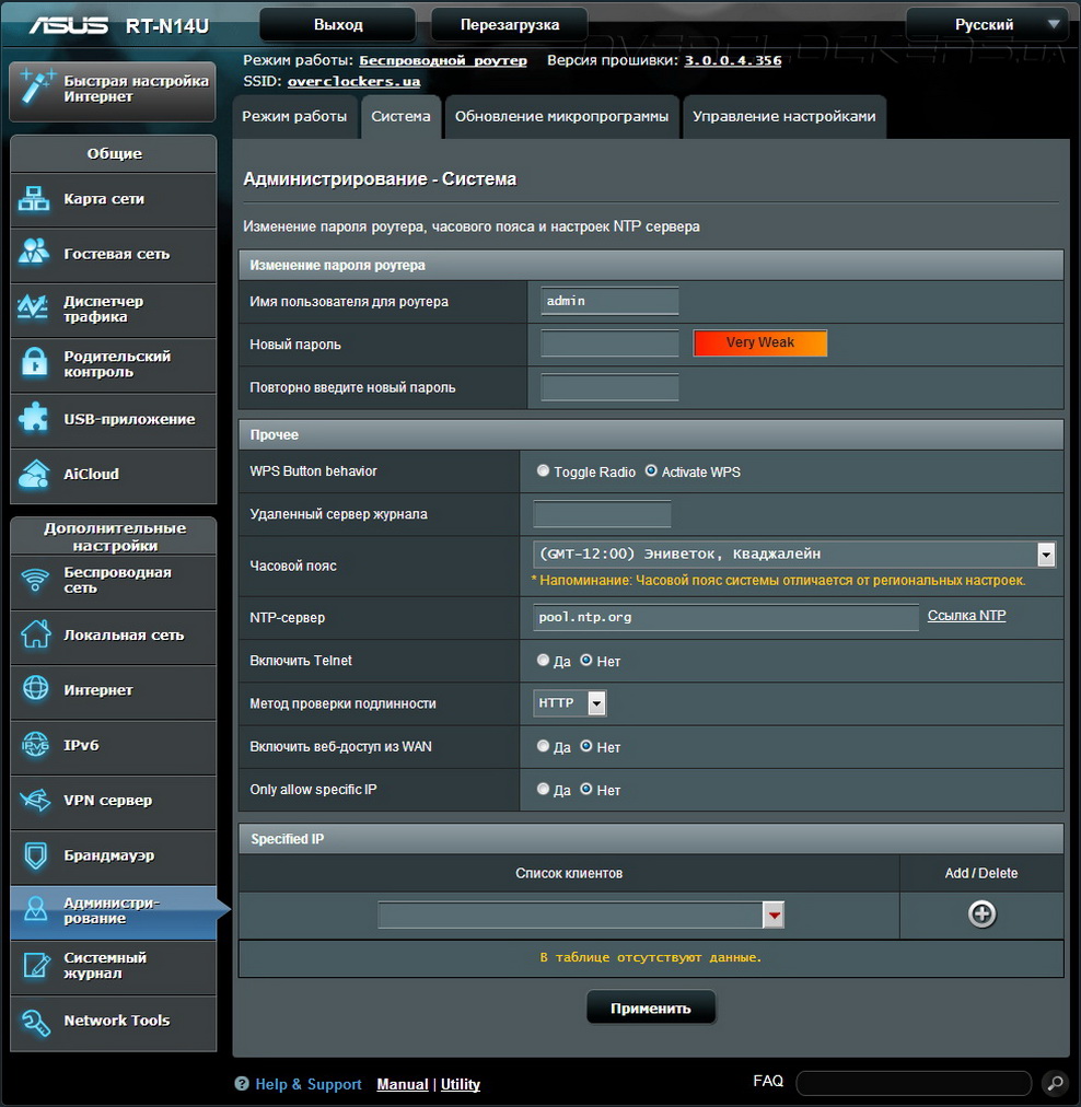 В пункте «Администрирование», находятся наиболее важные настройки маршрутизатора, отвечающие за работу в целом. Например, подпункт «Режим работы», позволяет настроить работу оборудования: точкой доступа или маршрутизатором. Открыть соединение к ASUS RT-N14U из сети Интернет или по Telnet также не составит труда.
