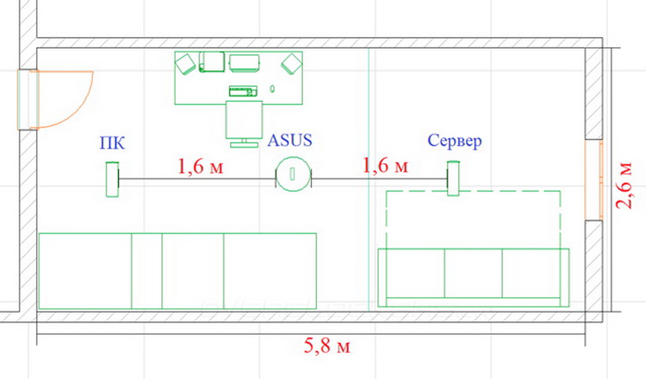 Сервер и клиентский ПК расположены в одной комнате. Расстояние каждого к ASUS RT-N14U составляет около 1,6 м. Такое размещение оборудования в квартире маловероятно, однако, данное размещение устройств нацелено на вычисление максимальной скорости по Wi-Fi.