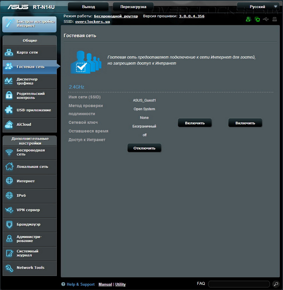 Одним из пунктов основных настроек является функция «Гостевая сеть». Суть технологии подразумевает изолирование пользователя, так называемого «гостя», подключенного к роутеру по Wi-Fi, от основной локальной сети, что полезно в плане безопасности. Данная технология будет актуальна в небольших местах собрания людей, например кафе, или даже дома, когда придут знакомые со своими мобильными устройствами и попросят временно предоставить им доступ к Интернет.