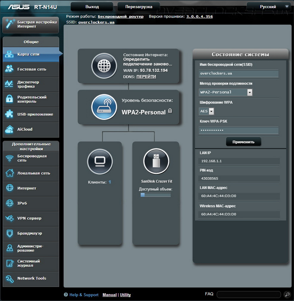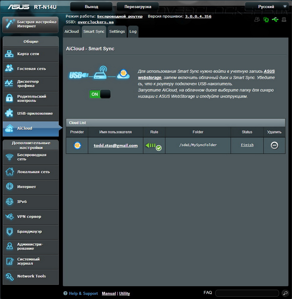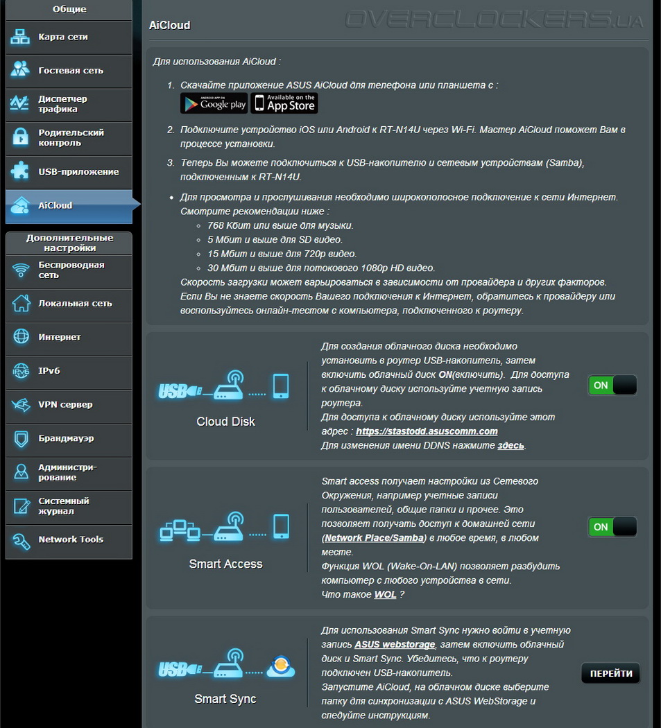 Подтверждением звания Cloud Router служит вкладка — AiCloud. Для возможности доступа к «облачному» хранилищу файлов и обмену данными пользователям маршрутизаторов ASUS предлагается одноименное приложение AiCloud, доступное для мобильных платформ на базе Android и iOS. Идея заключается в том, чтобы подключить накопитель по USB к маршрутизатору и предоставить общий доступ к информации на нем как в локальной сети, так и в Глобальной.