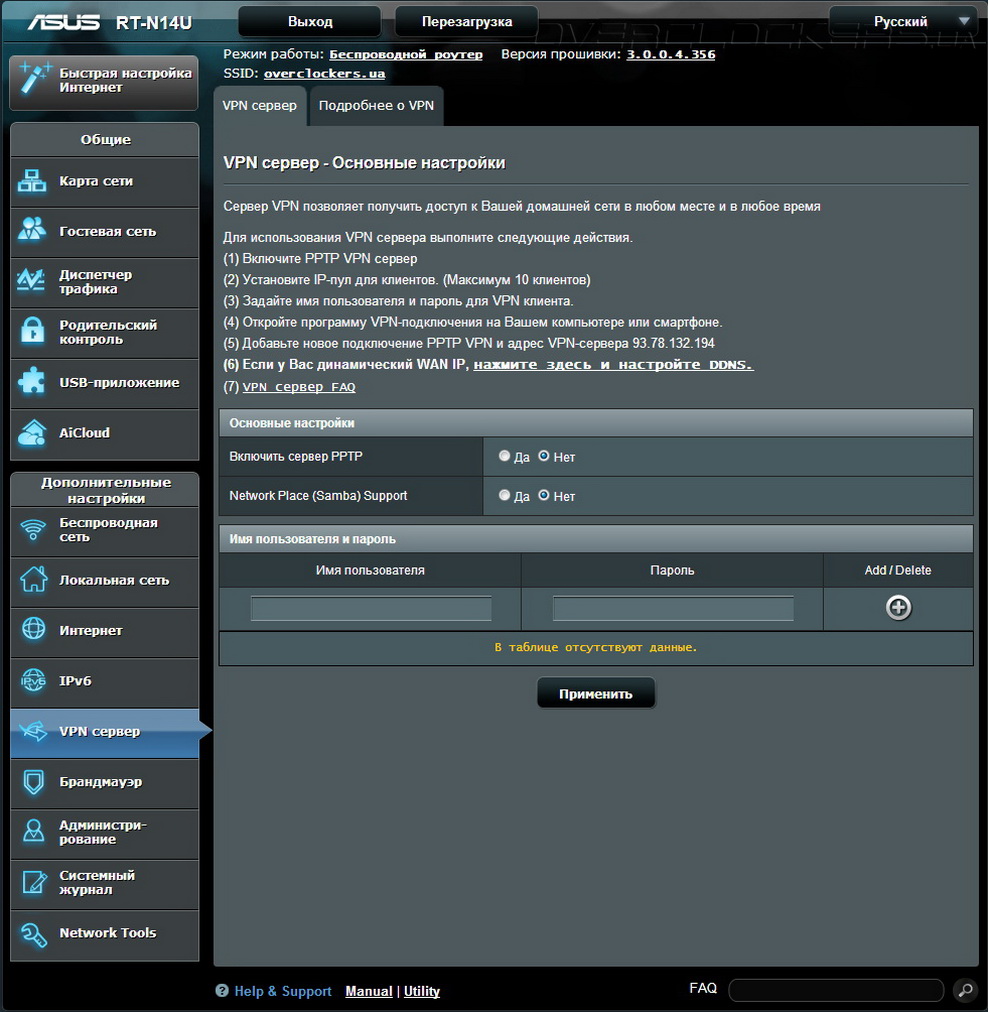 Объединить различные сети по всему миру поможет VPN-соединение, в котором наш подопытный выступит в роли сервера. К сожалению, туннель можно построить используя только PPTP, и очень жаль что обошли стороной L2TP и OpenVPN. Как всегда, к технологиям, где базовых знаний недостаточно, в меню роутера, присутствует ссылка на FAQ.