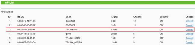 (Если корневой маршрутизатор поддерживает функцию WDS, то в качестве Wireless Mode (Беспроводного режима) вы можете выбрать Repeater (Ретранслятор).4. Найдите SSID корневого маршрутизатора в списке ТД, нажмите Connect (Соединение).