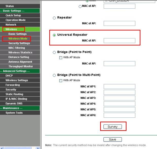 3. Нажмите Нажмите Wireless (Беспроводная связь) -> Wireless Mode (Беспроводной режим), здесь выберитеUniversal Repeater (Универсальный ретранслятор). Нажмите Survey (Обзор).