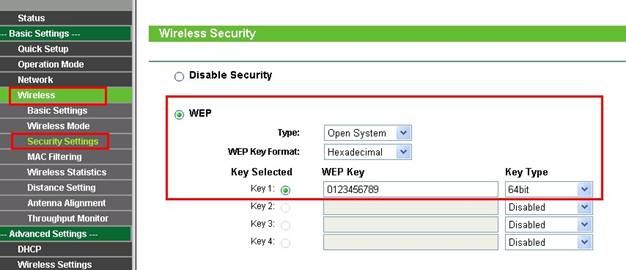 · Тип шифрования: открытый шестнадцатеричный WEP