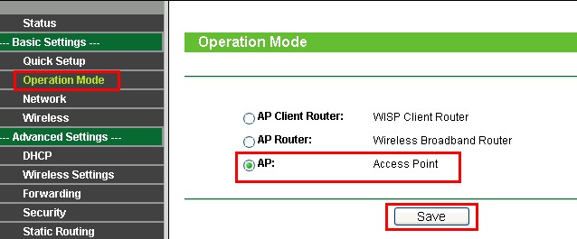 2. Нажмите Operation Mode (Режим работы), выберите режим АР (точки доступа) и нажмите Save (Сохранить).