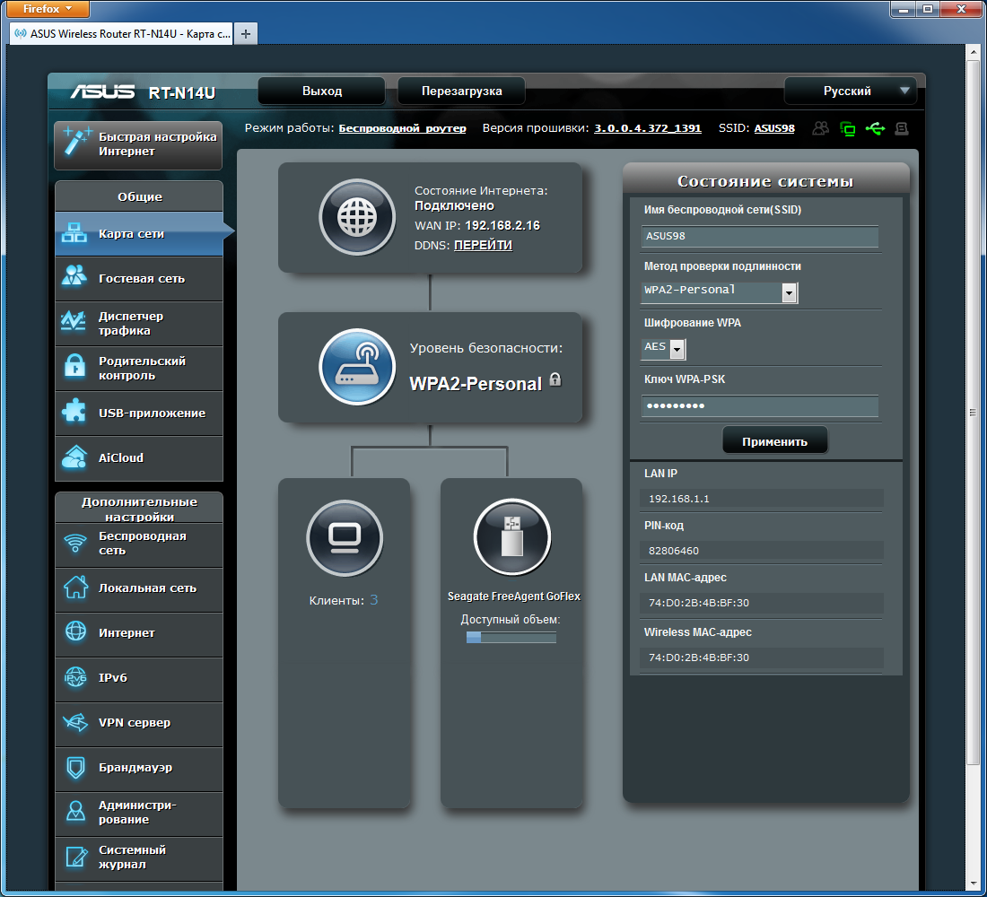 Первая страница интерфейса — «Карта сети» — предоставляет основную информацию о текущем состоянии устройства — подключение к сети Интернет, имя DDNS, имя сети Wi-Fi и режим защиты, подключенные клиенты и внешние устройства, версия прошивки. Также присутствуют кнопки перезагрузки и отключения USB-устройств, список выбора языка и другие пункты.
