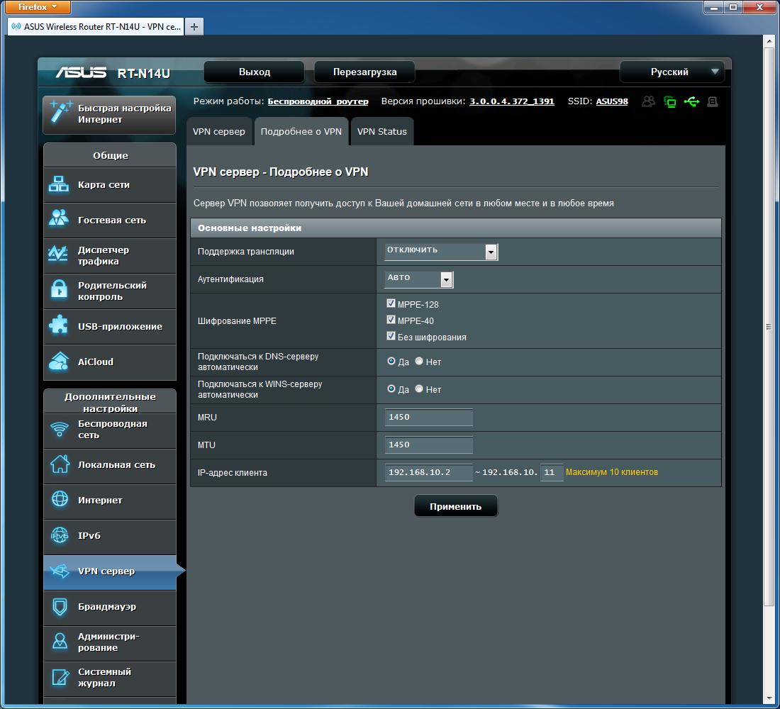 Как и старшие братья, устройство имеет встроенный сервер PPTP. Это один из наиболее удобных и универсальных способов удаленного подключения к локальной сети. Можно запрограммировать в сервисе до десяти пользователей. Поддерживается аутентификация MS-CHAPv1 и MS-CHAPv2 и шифрование MPPE.