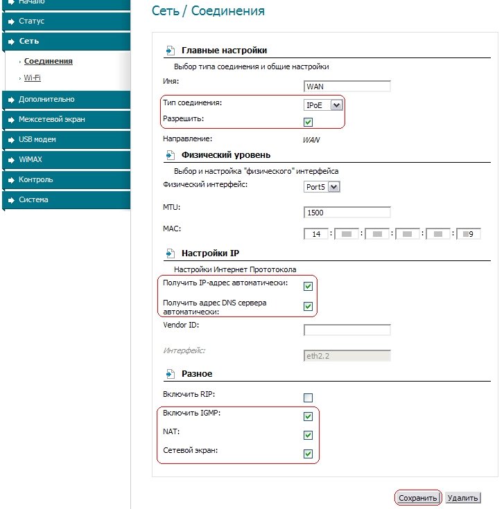 4. Откроется страница с настройками соединения. Необходимо убедиться, что выбран тип соединения IPoE и стоит галочка под типом рядом с пунктом Разрешить. Также должны присутствовать галочки напротив Получить IP-адрес автоматически, Получить адрес DNS сервера автоматически, Включить IGMP, NAT, Сетевой экран. Если что-то из вышеперечисленного отключено, то необходимо поставить галочку, применить настройки и сохранить изменения.