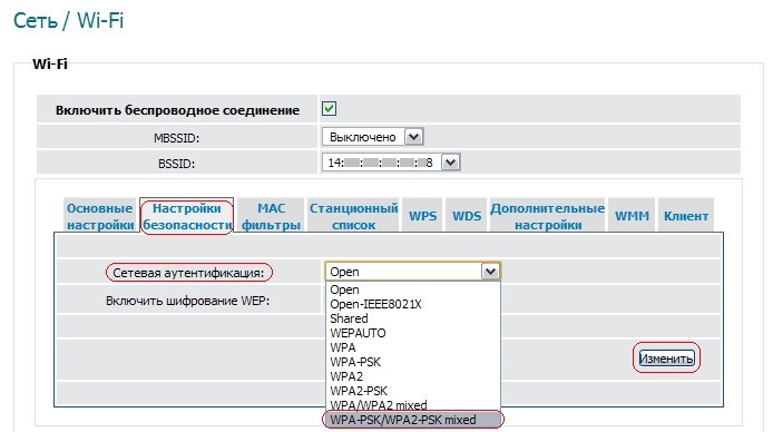 2. Далее выберите подраздел Настройка безопасности, где в выпадающем списке Сетевая утентификация необходимо выбрать пункт WPA-PSK/WPA2-PSK mixed.