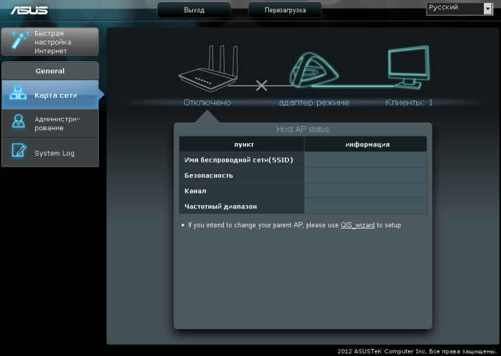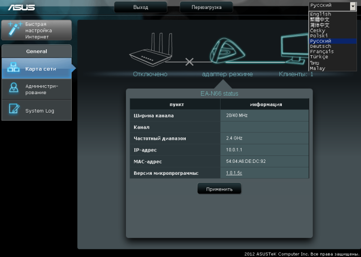 Внешний вид веб-интерфейса EA-N66 характерен для прошивок ASUS-WRT – выполнен в тёмных тонах и доступен на одиннадцати языках. Так как веб-интерфейс устройства в режиме беспроводного клиента имеет лишь необходимый минимум настроек, то мы рассмотрим все пункты меню.