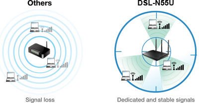 Технология ASUS Ai Radar обеспечивает улучшенное покрытие сети Wi-Fi без увеличения энергопотребления. Интеллектуально определяя расположение подключенных устройств, DSL-N55U преобразует слабый всенаправленный сигнал в сильный однонаправленный, что обеспечивает более высокую скорость передачи данных.