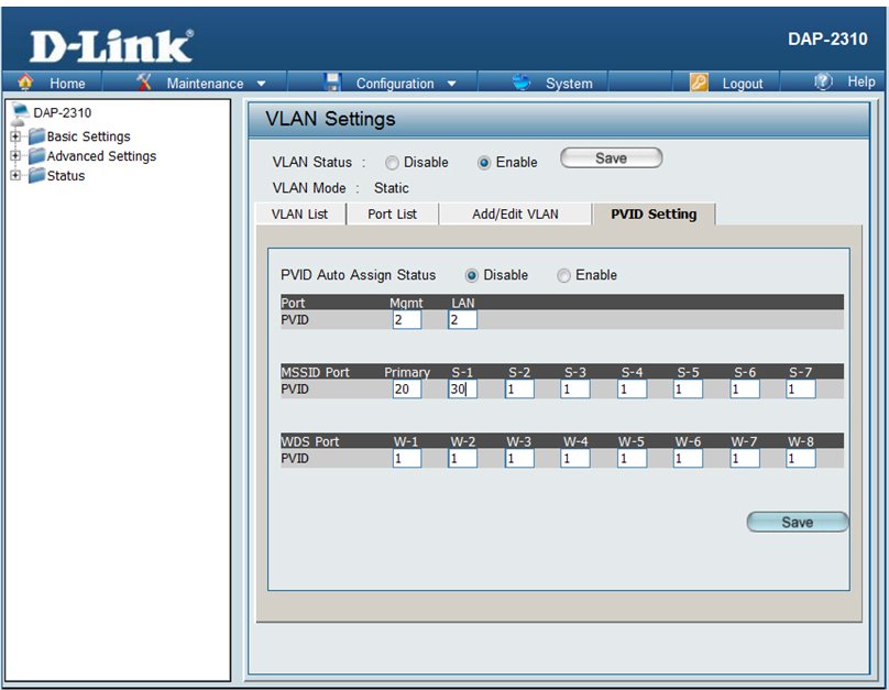На точках доступа DAP-2310, DAP-2360, DAP-2553, DAP-2690 настроены по два SSID, первый с паролем для администрации, второй SSID - открытая Wi-Fi сеть без пароля для гостевого доступа в Интернет. Эти SSID привязаны к VLAN20 и VLAN30 соответственно. Управление Точками Доступа вынесено в отдельный VLAN2.