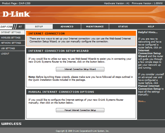 Теперь перейдем к ручным настройкам многофункционального сетевого устройства D-LINK DAP-1350. Его основной функцией является коммутация Ethernet-сегмента сети (проводного) с оборудованием, которое работает по беспроводным каналам связи, а также организации доступа к интернет, в том числе и средствами 3G внешних модемов. Именно по этой причине основное меню настройки разделено на четыре закладки: «INTERNET SETTINGS», «WIRELESS SETTINGS», «NETWORK SETTINGS» и «USB SETTINGS».