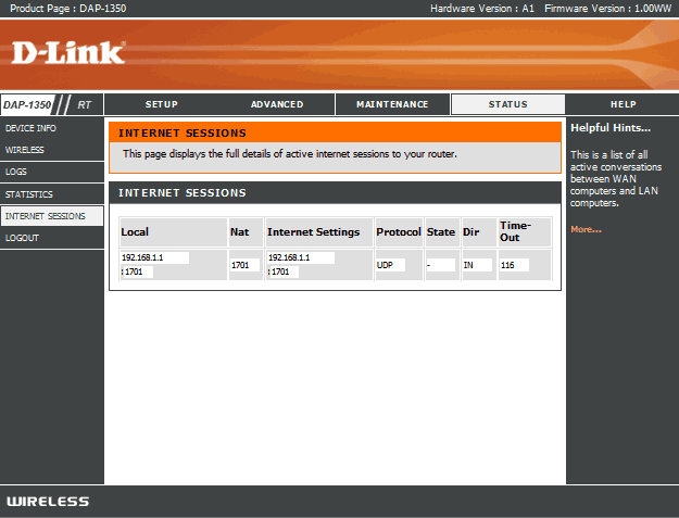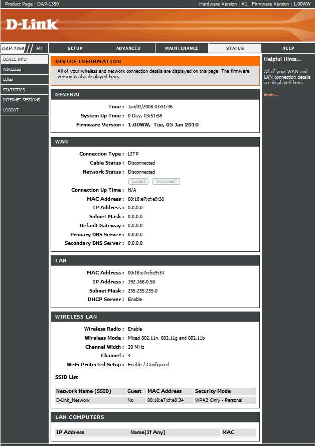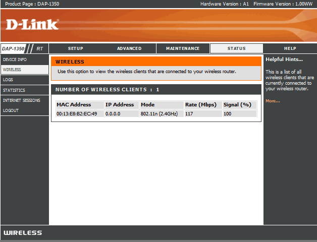 На этой закладке можно проанализировать статус и настройки всех основных интерфейсов D-LINK DAP-1350, что позволяет оценить все его основные параметры.