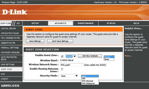 Функционал модели D-LINK DAP-1350 «GUEST ZONE» позволяет создать отдельную Wi-Fi зону беспроводного сегмента сети для подключения клиентов с малым уровнем доверия с точки зрения безопасности. Это обеспечит им доступ только к интернету, минуя вашу локальную сеть. Очень удобная функция для кратковременного подключения большого числа временных клиентов беспроводной сети.