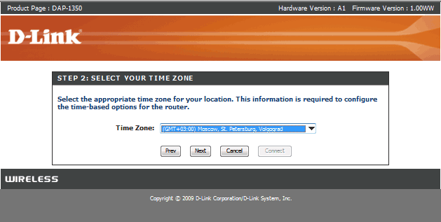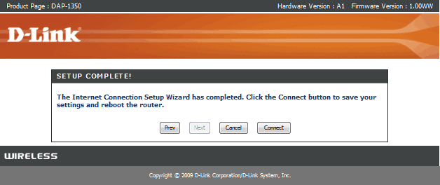 По окончанию пошагового алгоритма настройки необходимо сохранить все заданные параметры. После нажатия кнопки «Connect» настройки будут сохранены, а D-LINK DAP-1350 перезагружен для их корректного применения и функционирования.