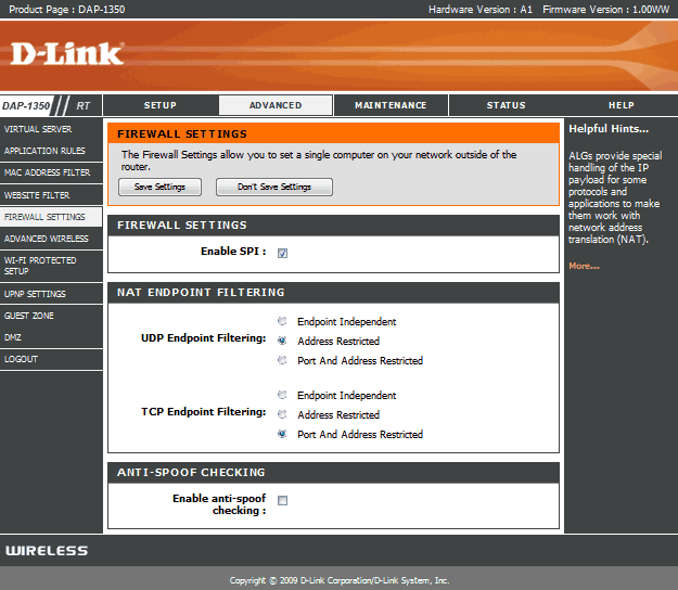Страничка основных настроек сетевого экрана. Здесь можно включить поддержку технологии SPI (stateful packet inspection) - это функция дополнительной проверки пакетов на принадлежность существующему соединению. Чуть ниже можно задать режим работы службы NAT. Включить функцию Anti-spoof проверки.