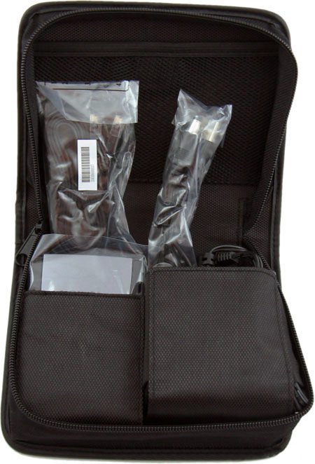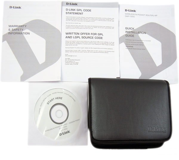 Интересной стороной модели D-LINK DAP-1350 должна стать её комплектация. Здесь все продумано для быстрого старта и использования данного решения. Все компоненты благоразумно упакованы вместе с D-LINK DAP-1350 в один черный чехол, который выполнен из кожзаменителя. Весь набор должен обеспечить полноценное использование заложенного функционала в данную точку доступа / маршрутизатора / клиента.