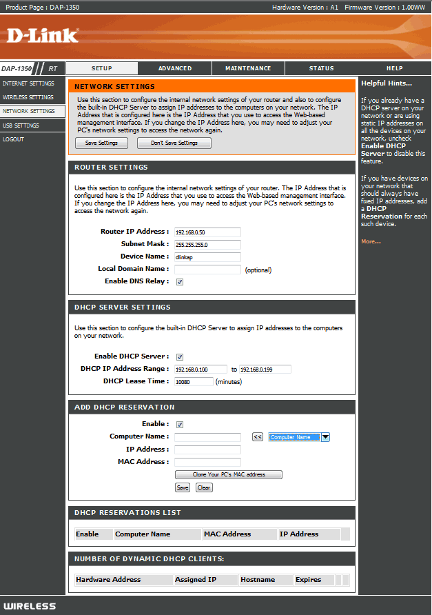 Настройки локального сегмента сети осуществляется на закладке «NETWORK SETTINGS ». Здесь можно задать IP-адрес D-LINK DAP-1350 и всесторонне настроить DHCP-сервер. Он обеспечит пользователю раздачу IP-адресов для клиентов WLAN и LAN сегментов. Есть возможность включения/выключения этого сервиса. Здесь можно установить диапазон выдаваемых адресов с учетом времени, в течение которого данные IP-адреса будут зарезервированы за получившим его клиентом (по его MAC-адресу). Есть возможность настроить статический DHCP. Внизу присутствует таблица зарезервированных IP и клиентов, воспользовавшихся динамической выдачей.