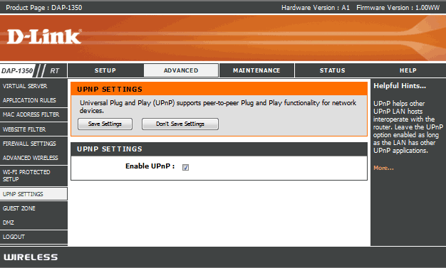 Страничка включения UPnP (Universal Plug and Play). Эта архитектура одноранговых соединений между персональными компьютерами и интеллектуальными устройствами, установленными, например, дома, что обеспечивает автоматическое подключение подобных устройств друг к другу и их совместную работу в сетевой среде, в результате чего сеть становится доступной большему числу людей.