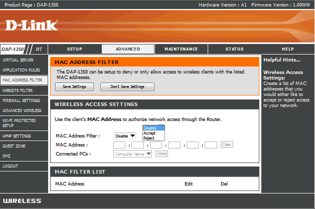 Можно включить и выбрать один из двух режимов фильтрации MAC-адреса подключающихся клиентов беспроводного сегмента сети.