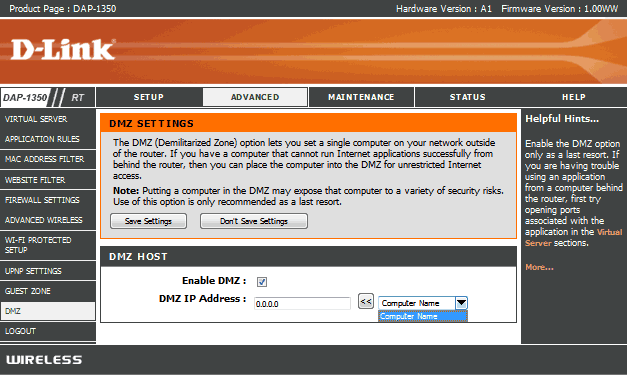 Есть возможность установить в пункте «DMZ SETTINGS» IP адрес локальной станции, которая будет получать все пакеты, пришедшие на любой порт маршрутизатора. Значит, для внешнего клиента именно она будет иметь назначенный на LAN-интерфейс IP-адрес и полностью реагировать на все его запросы.