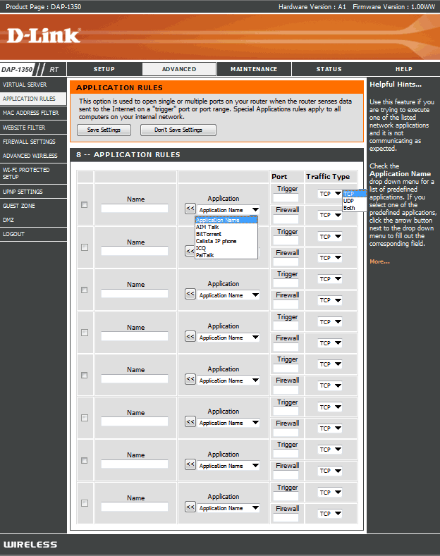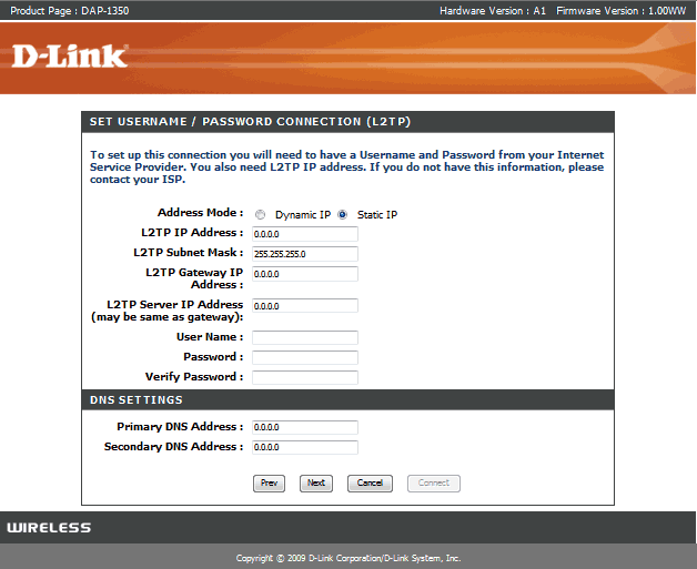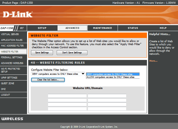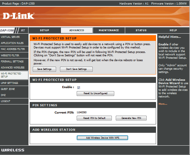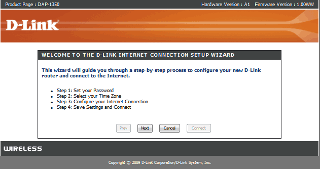 Данная модель позиционируется как сетевое устройство с очень простым алгоритмом настройки. Это подтверждает вывод всех основных режимов работы на переключатель с тыльной стороны корпуса, а настройку Wi-Fi сети на кнопку автоматической настройки. Однако доступ к богатому функционалу D-LINK DAP-1350 и его тонкой настройке остался точно таким же, как и у других решений от этого производителя. Удобный и простой алгоритм быстрой настройки здесь реализован при помощи пошагового мастера в WEB-интерфейсе самого устройства.