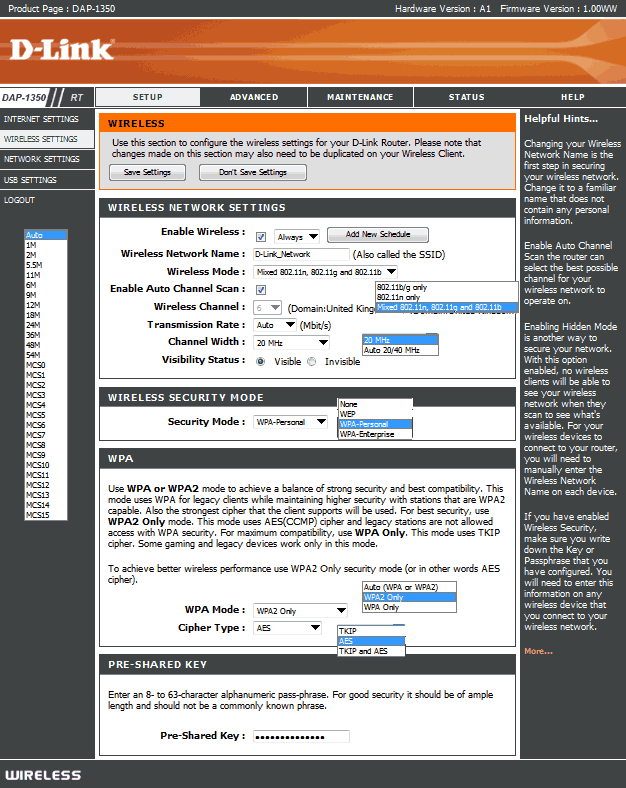 В пункте меню «WIRELESS SETTINGS» выбирается стандарт работы Wi-Fi беспроводной сети, задается имя соединения, которое будет фигурировать при подключении клиентов, можно выбрать номер канала линии точки и включить безопасный режим передачи данных по беспроводному сегменту. Здесь в ручном режиме можно выбрать метод авторизации при подключении, а так же, исходя из выбранного способа авторизации, можно задать и алгоритм шифрования радиоканала. Поддерживаемые стандарты шифрования и аутентификации указаны в таблице спецификаций, приведенной выше. Есть возможность отключения широковещательного SSID (имени сети и ее параметров входа) статуса видимости, включить дополнительные расширения спецификации, отключить/включить беспроводной канал и т.д. и т.п.