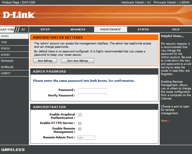 Заменяем стандартный пароль доступа к D-LINK DAP-1350 на свой уникальный. Это существенно повысит защиту канала связи от несанкционированного доступа в вашу сеть.