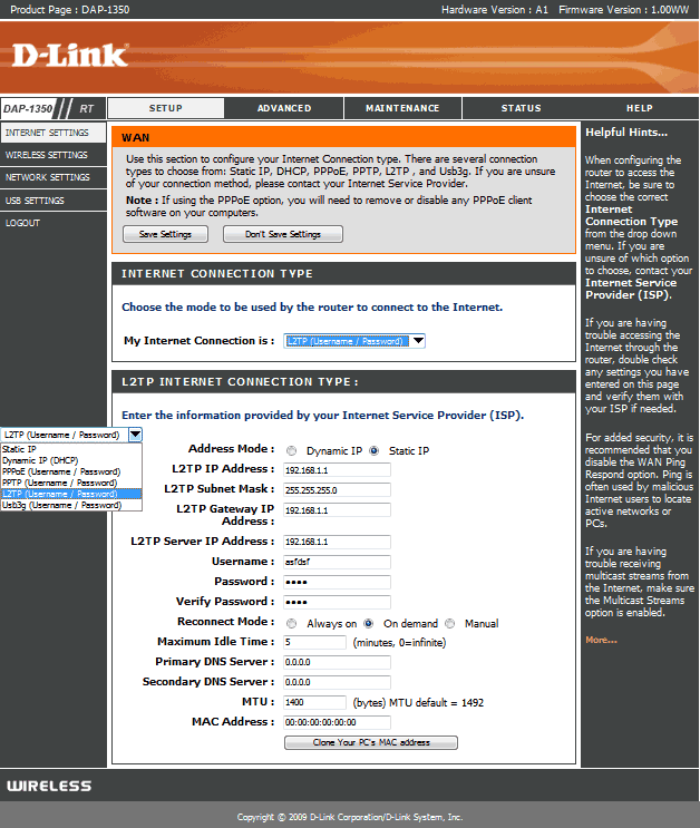 Страничка «INTERNET SETTINGS» позволяет задать в ручном режиме параметры работы подключения к провайдеру по LAN-интерфейсу, такие как: способ получения IP-адреса во внешней сети - динамически через внешний сервер DHCP или задать в ручном режиме, а также выбрать способ соединения по шифрованному каналу с провайдером связи через стандарты PPPoE, PPTP, L2TP, указать MTU размер пакетов и т. д. Есть возможность клонирования MAC-адреса или указания его вручную, если ваш провайдер ведет раздачу разрешений только по MAC-идентификации клиента. Здесь же можно выбрать подключение к провайдеру средствами 3G USB модема и указать параметры такого соединения.