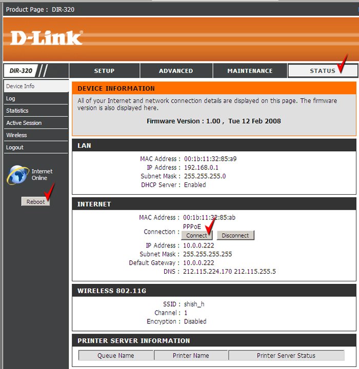 Для проверки правильности установок и переподключения PPPoE следует нажать кнопку «SТATUS» в верхнем меню (см. рис).