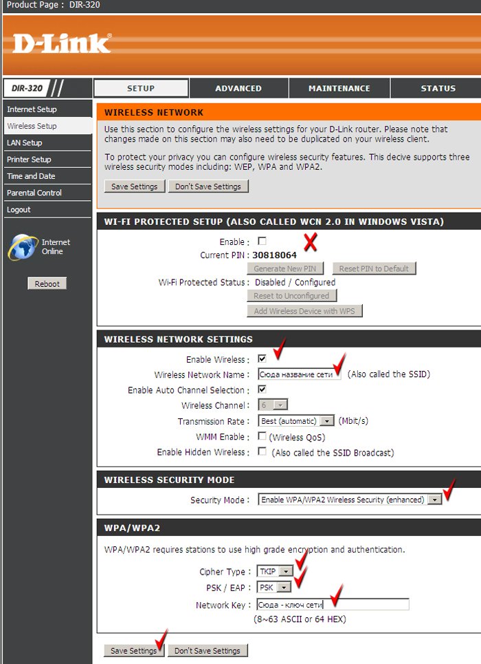 - Network key (ОЧЕНЬ ВАЖНО!) – любой секретный ключ вашей сети (мин 8 символов, английские буквы и цифры)