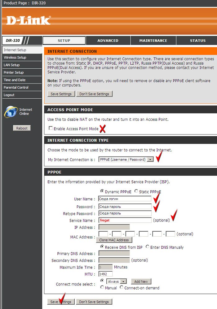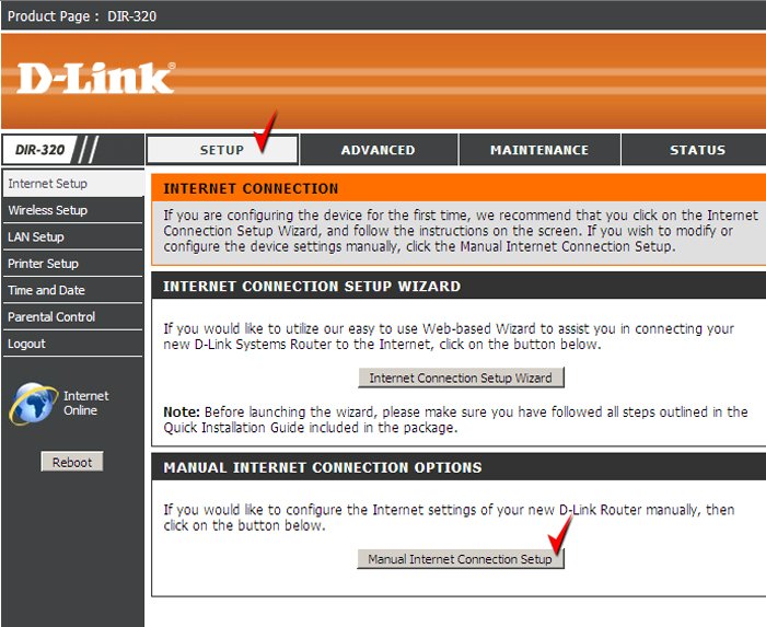 Тем не менее, параметры PPPoE соединения должны быть введены в роутер один раз на этапе настройки. Для этого нажмите кнопку «SETUP» и «INTERNET SETUP» в веб интерфейсе управления роутера.