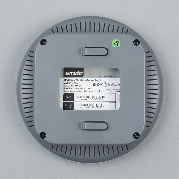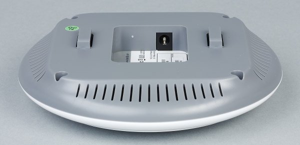 Вторая часть корпуса из серого матового пластика имеет по периметру решетки вентиляции. На ней находится и отверстие для скрытой кнопки сброса. Диаметр модели составляет 14,4 см, а высота с учетом подставки — около 4 см. Обратим внимание на отсутствие кнопки WPS, но учитывая варианты установки точки доступа, это не является серьезным упущением.