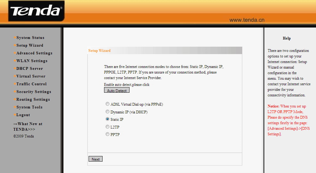 При первом входе в веб-интерфейс настройки, устройство предлагает воспользоваться для конфигурирования пошаговым мастером. Отказаться от настройки Tenda W311R+ с помощью пошагового мастера и полностью настроить подключение вручную не получится, так как этот мастер (он же вызывается разделом меню Setup Wizard) – единственный способ выбрать способ подключения.