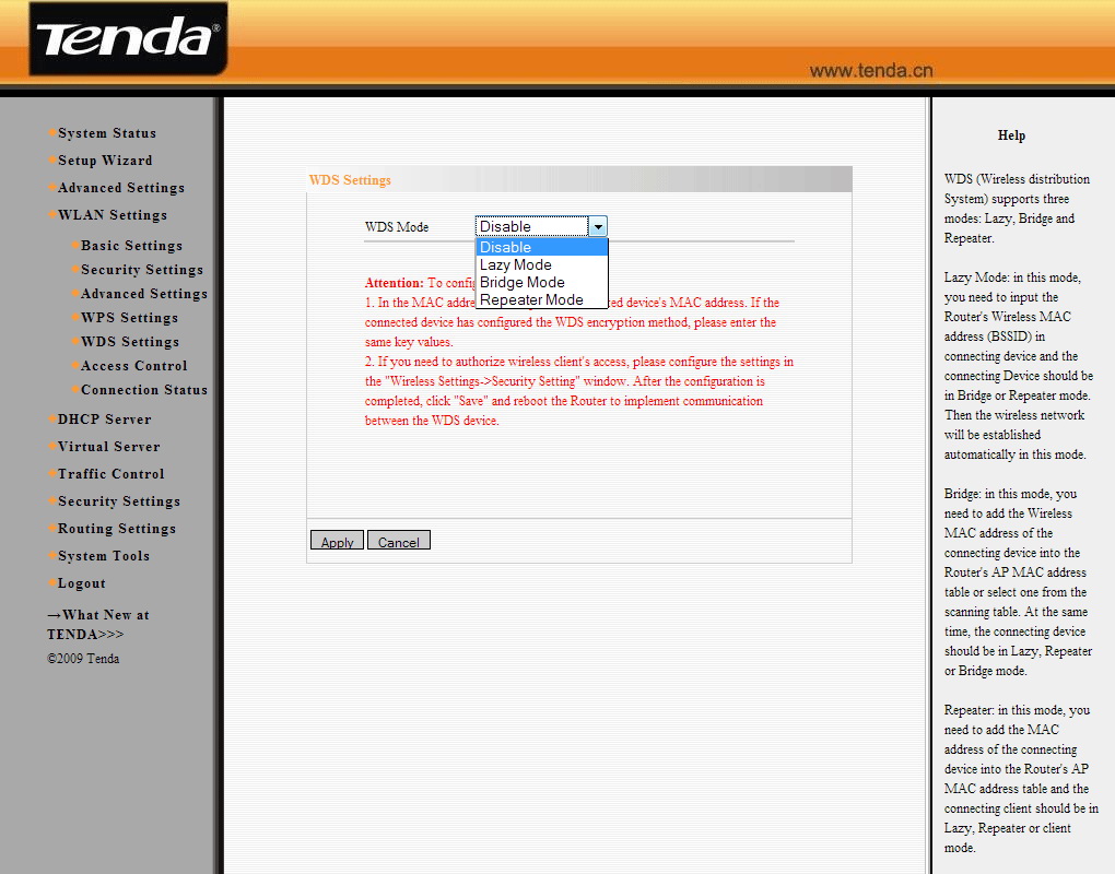 Ещё одна особенность встроенной беспроводной точки доступа маршрутизатора Tenda W311R+ это умение работать в режиме WDS, да ещё и в нескольких вариантах: Bridge – для объединения по Wi-Fi проводных сетей, Repeater – для увеличения зоны покрытия беспроводной сети с помощью нескольких устройств и Lazy (очевидно, для ленивых) – для соединения с другими устройствами в режимах Bridge или Repeater без необходимости прописывания их MAC-адресов.