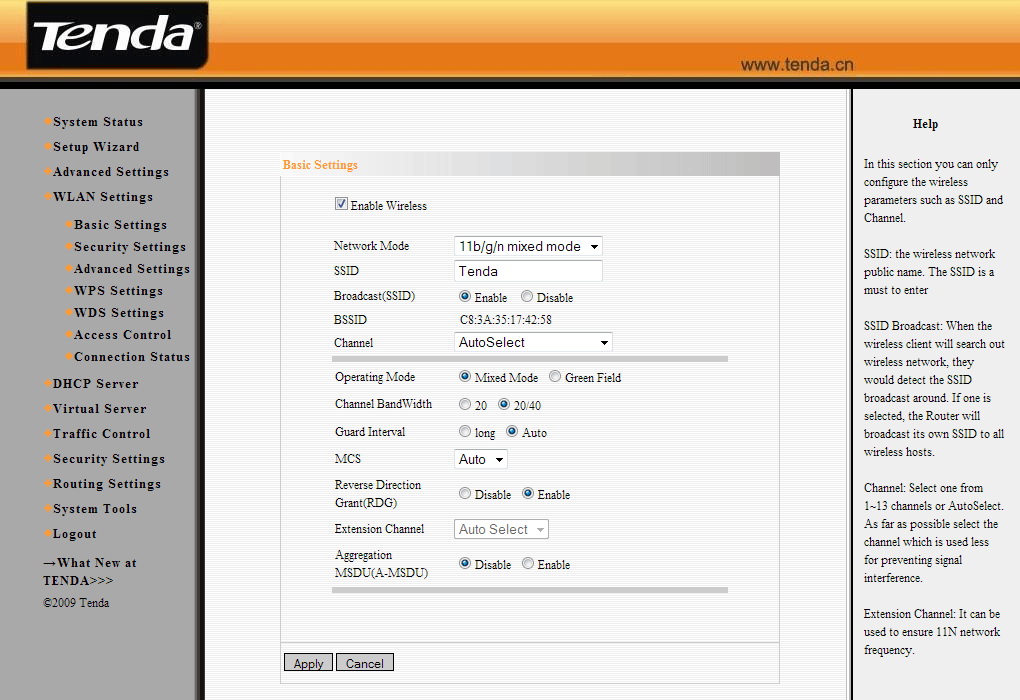 Устройство позволяет выбрать один из четырёх режимов работы встроенной точки доступа Wi-Fi – смешанный 802.11b/g, только 802.11b, только 802.11g и смешанный 802.11b/g/n. Именно последний режим представляет наибольший интерес. На скриншоте представлены дополнительные настройки для этого режима, настройки для остальных режимов ограничиваются только выбором одного из 13 каналов Wi-Fi и включением/выключением SSID Broadcast.